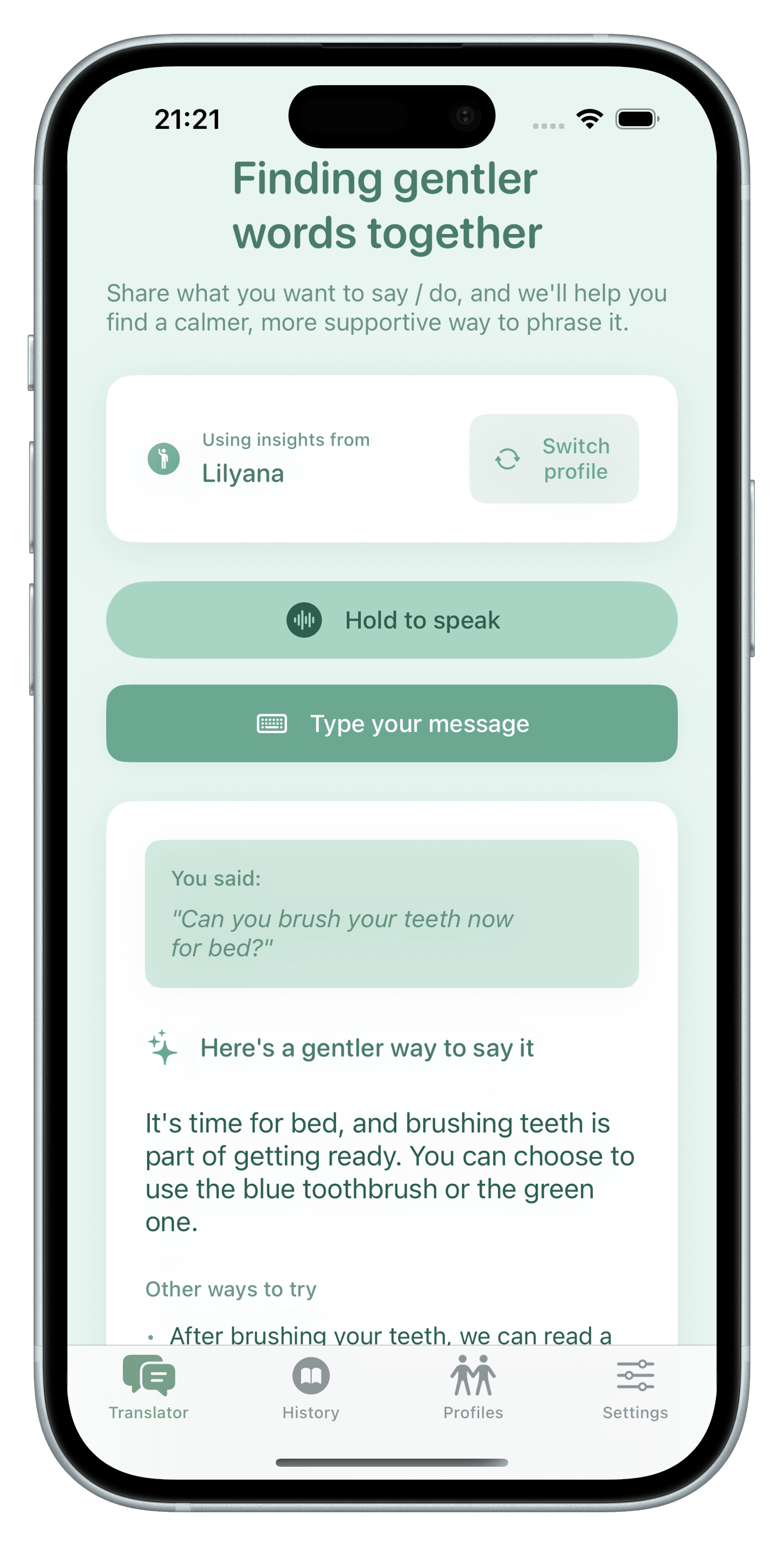 Gentle Ally is designed to be simple and practical—describe a situation, pick a tone and age range, and get three low-demand phrases you can use right away. No endless prompting. No trial and error. Just helpful starting points when you're in the moment and need the right words fast.